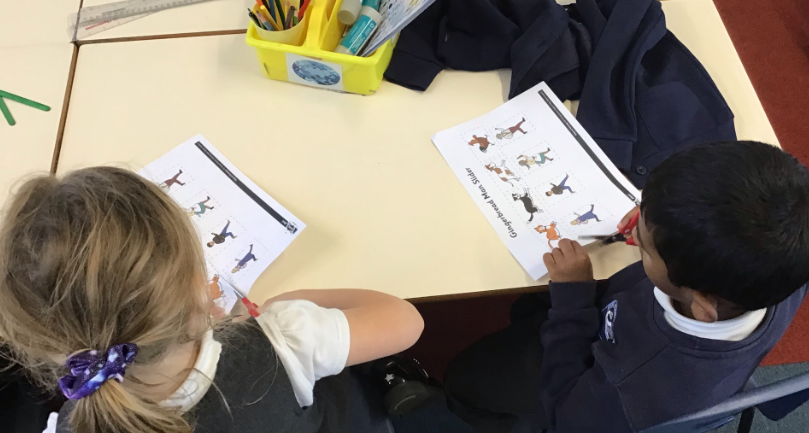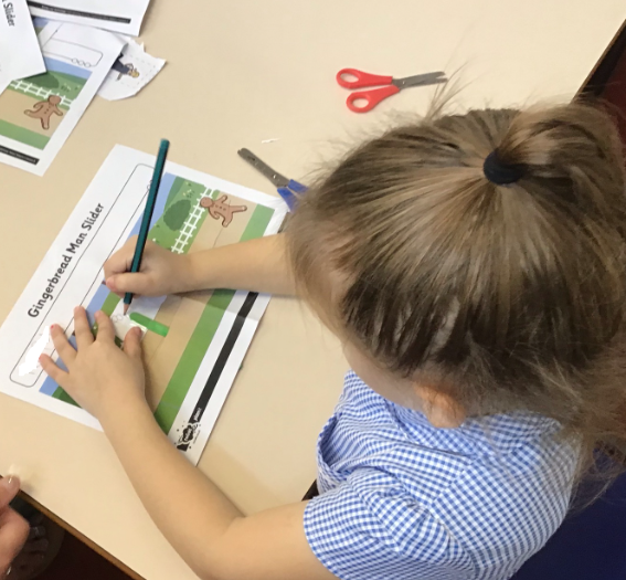 In DT, we looked at the story of The Gingerbread Man and how he is chased by different characters. We then created our own sliders to show the characters chasing after The Gingerbread Man. We had to be careful with our scissors when we were cutting the slit for the lolly stick.