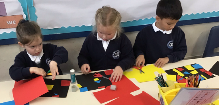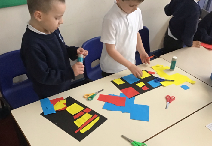 In Art, we looked at the work of Piet Mondrian and his use of the primary colours red, blue and yellow. We then used red, blue and yellow paper to create our own collages in the style of Mondrian.