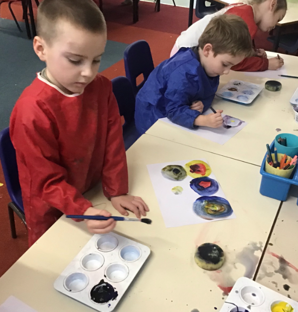 In art, we have looked at the artist Kandinsky and his famous 'circles' painting. We had a go at mixing our own colours using the primary colours, black and white, and used these colours to create our own paintings.