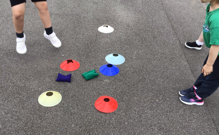 In PE we had fun trying to throw a beanbag to hit a target. We used tall cones first, trying to knock them over like skittles. Then we moved to flatter cones where the beanbag had to land in between.