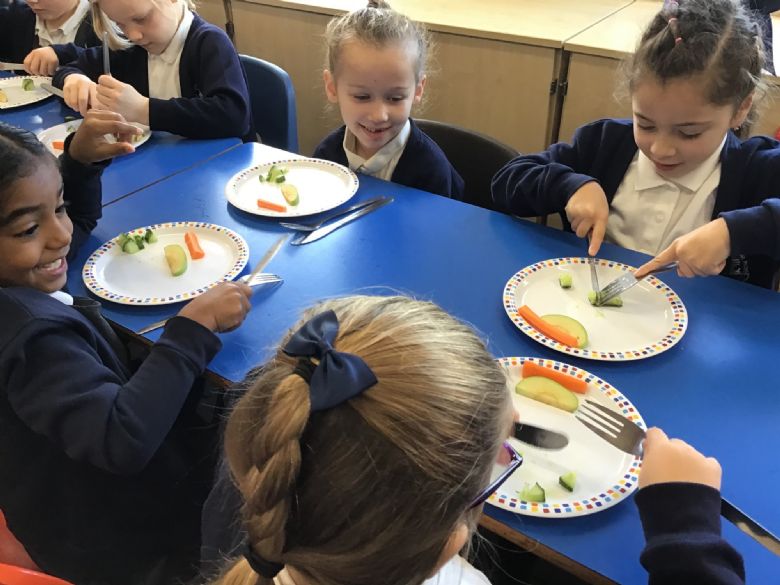 The children enjoyed taking part in a cutlery workshop on Thursday. They practised the ‘stick, slide, saw’ strategy during the session. They stuck their fork in to a piece of food, slid the knife down the fork and then sawed the food into pieces. The children rehearsed this technique using pieces of cucumber, apple and raw carrot.