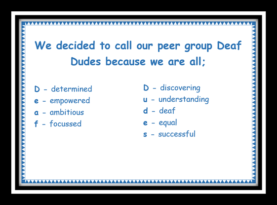 The children and staff working in our ARP all join together for a deaf peer group session on a bi-weekly basis. The peer group is currently named ‘Deaf Dudes’ by the children. This session aims to boost the children’s personal understanding of deafness, raise their awareness of deafness in the wider world and to develop skills such as communication (in various forms) and language as well as empathy, teamwork and life skills. The sessions are planned by the ARP staff and heavily influenced by the children’s interests and questions. The planning is also supported by the Iowa Extended Core Curriculum, which focusses on 8 specific areas of need for deaf children, which encompasses a range of specialised needs not covered in the general education curriculum, such as: Audiology, Career Education, Communication, Family Education, Functional Skills for Educational Success, Self Determination and Advocacy, Social and Emotional Skills and Technology.