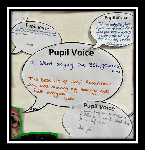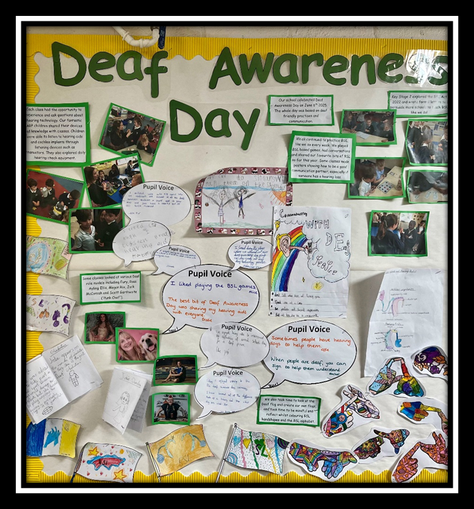 The Teacher of the Deaf ensures that all staff are trained in deaf-friendly teaching strategies and the use of equipment that improves the listening environment for deaf pupils. They also ensure that all members of the school community have up-to-date Deaf Awareness training, so deaf pupils are fully included in all aspects of school life. An annual Deaf Awareness Day is held in school to promote communication and inclusion, which is greatly enjoyed by everyone!
