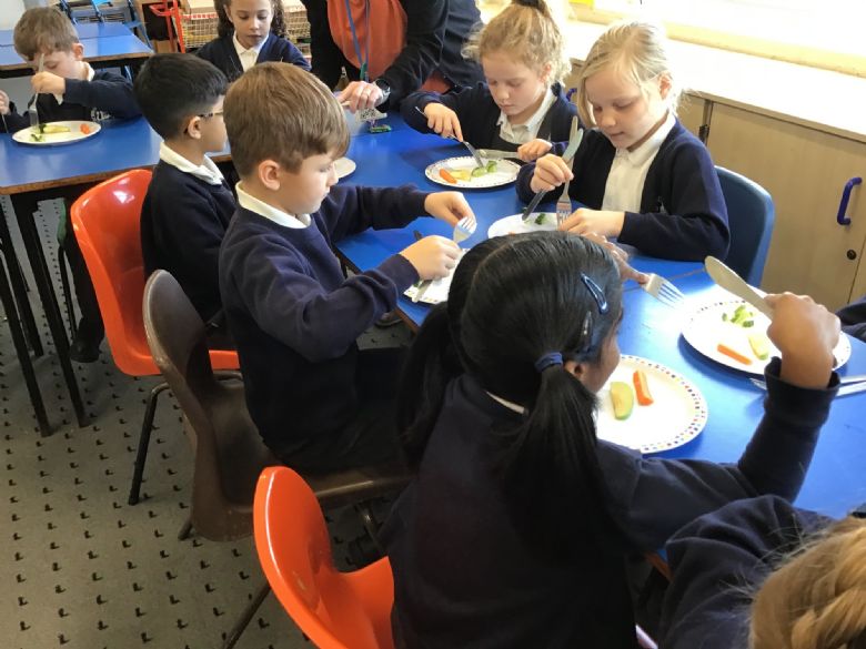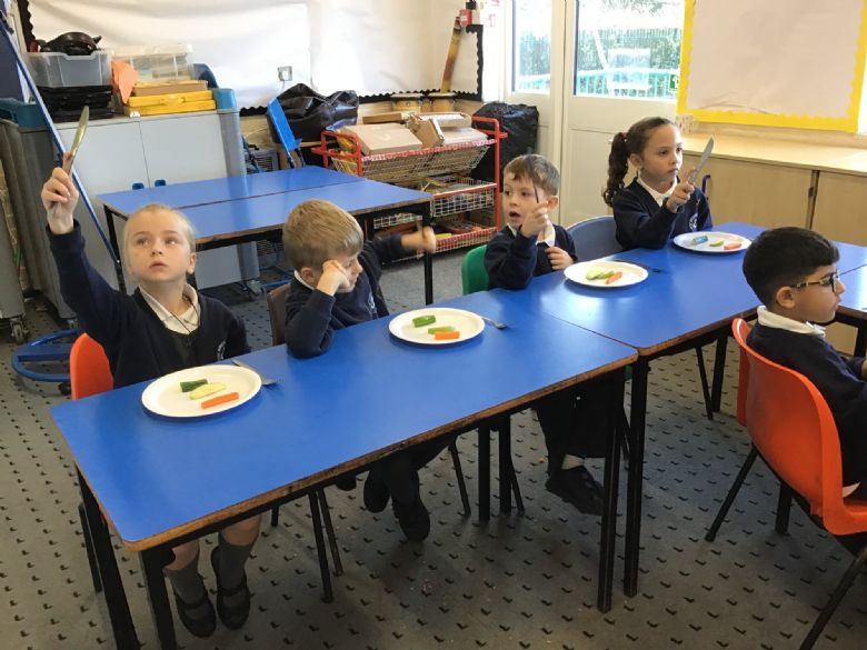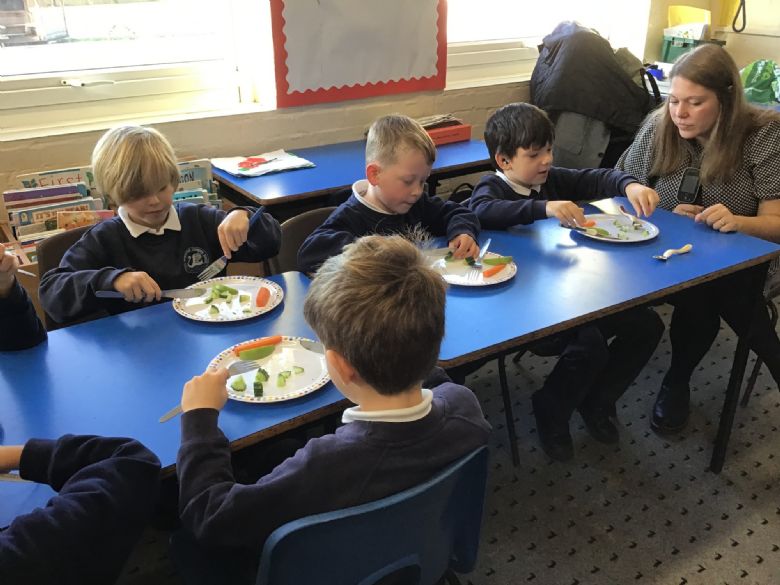 The children enjoyed taking part in a cutlery workshop on Thursday. They practised the ‘stick, slide, saw’ strategy during the session. They stuck their fork in to a piece of food, slid the knife down the fork and then sawed the food into pieces. The children rehearsed this technique using pieces of cucumber, apple and raw carrot.