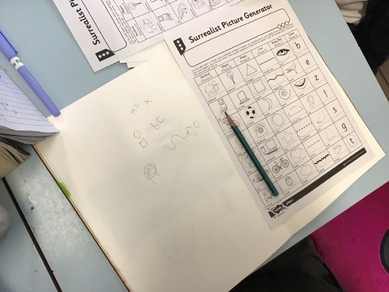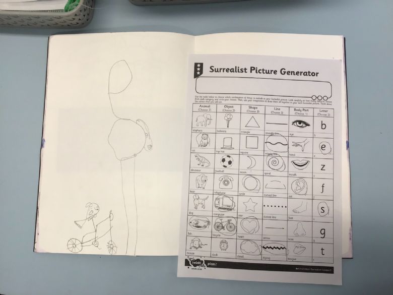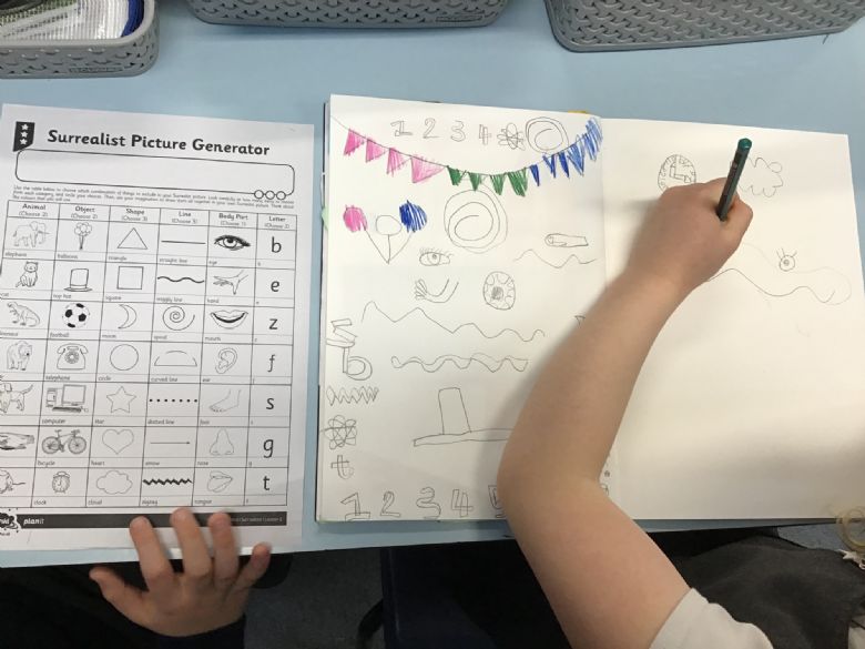 This week in Art, we studied Surrealism. The children studied a range of different paintings and spotted how shapes, lines and strange creatures had been drawn. Afterwards, they used their own Surrealist Picture Generator to help them create their own drawings. The children had to include 2 animals, 2 objects, 3 shapes, 3 lines, 1 body part and 2 letters. Can you spot these in their drawings?