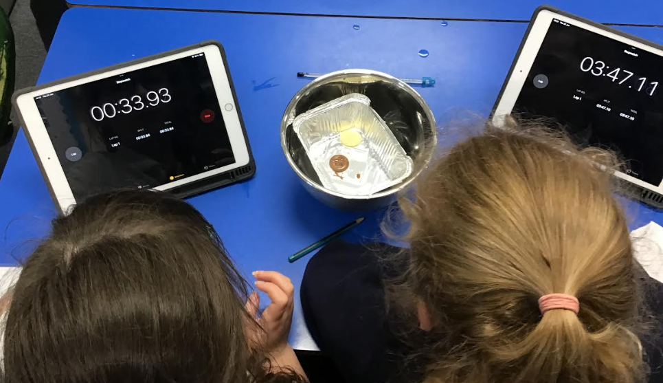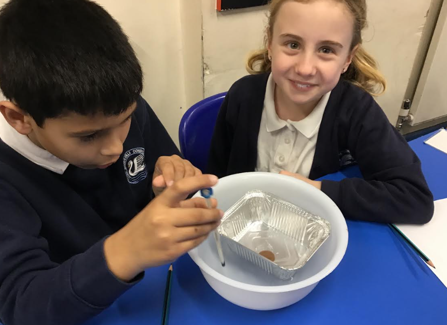 As part of our science topic on changes of state, we carried out investigations which involved melting chocolate (white and milk chocolate). We used our measuring skills and observational skills. We found out that white chocolate melts more easily than milk chocolate.